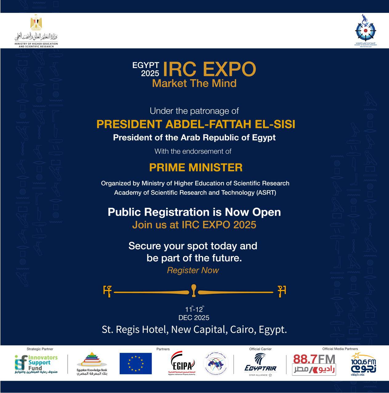 يُقام هذا العام المعرض الدولي لتسويق مخرجات البحوث IRC Expo 2025 في فندق سانت ريجيس بالعاصمة الجديدة، تحت رعاية فخامة رئيس الجمهورية، وبحضور دولة رئيس الوزراء ومعالي وزي