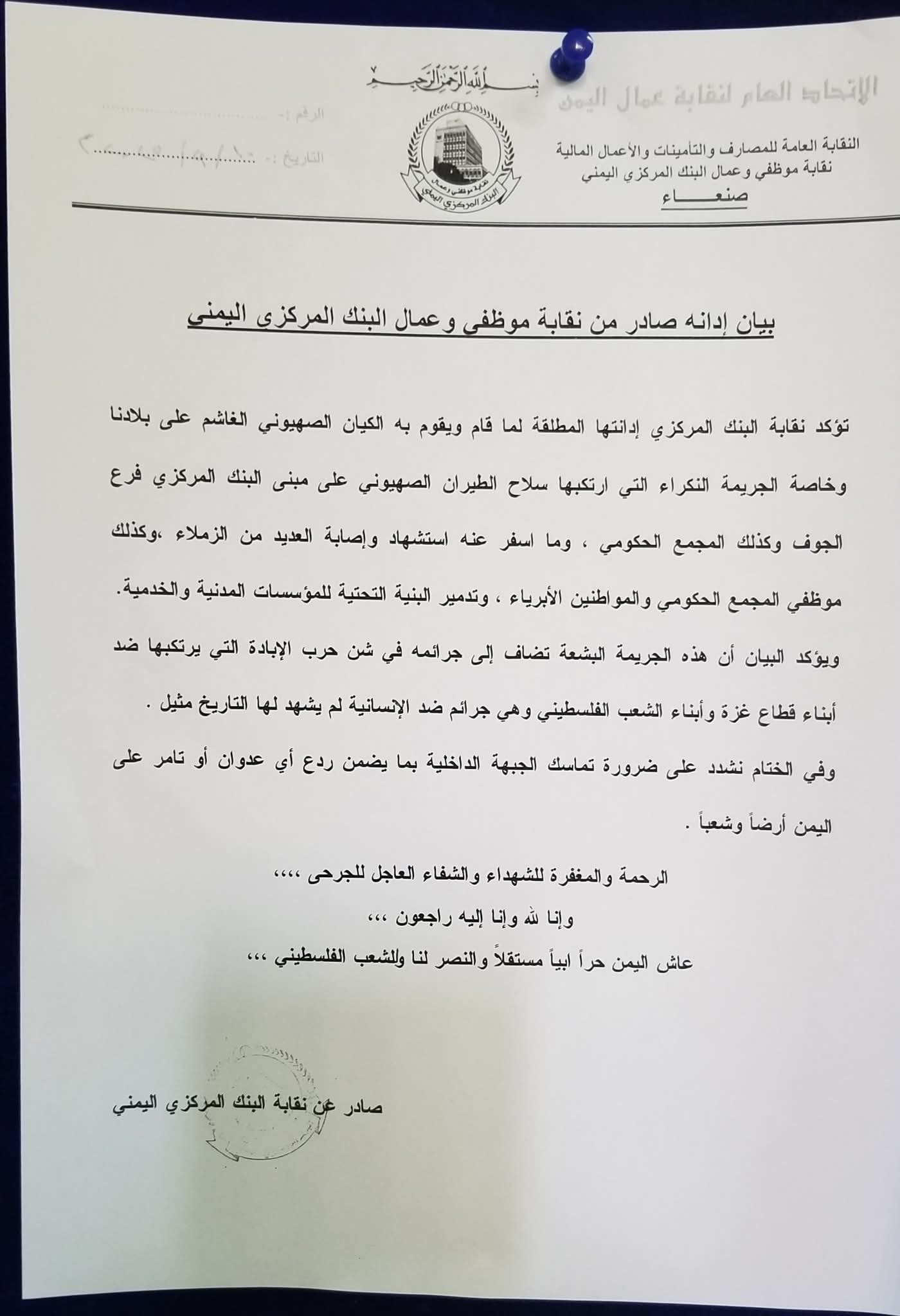 أدانت نقابة وموظفي البنك المركزي اليمني العدوان الإسرائيلي على فرع البنك في محافظة الجوف، وكذلك المجمّع الحكومي، وما أسفر عنه من استشهاد وإصابة العديد من موظفي الب