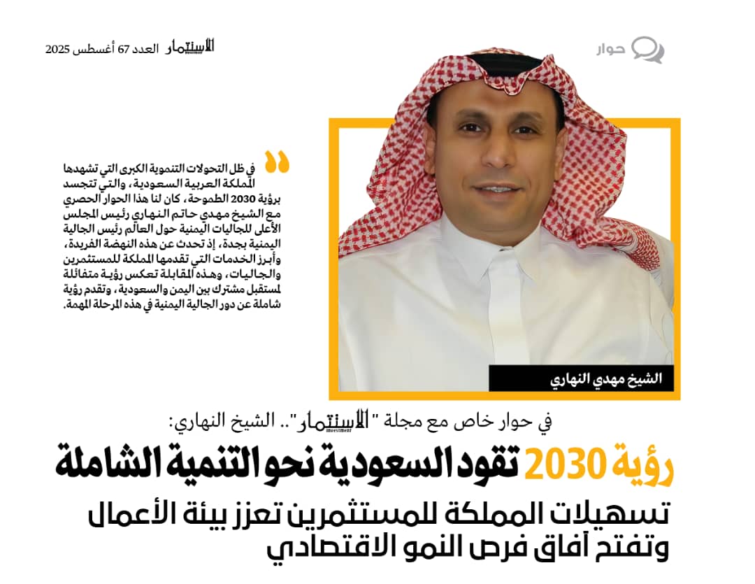 في حوار خاص مع مجلة الاستثمار، أشاد رئيس المجلس الأعلى للجاليات اليمنية في السعودية الشيخ مهدي النهاري، بالرعاية الكريمة التي تحظى بها الجالية اليمنية من قيادة ال