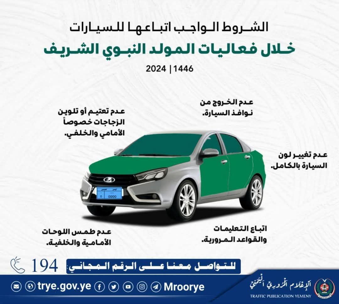 شرطة المرور تنبه بشروط تزيين السيارات خلال فعاليات المولد النبوي الشريف